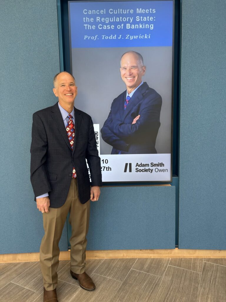 At Vanderbilt University's Owen Graduate School of Management, Todd Zywicki, George Mason University Foundation Professor of Law at Antonin Scalia Law School, delivered a lecture titled "Cancel Culture: Debanking". Zywicki discussed how financial institutions deny services based on political or religious views, discussing the implications for free speech and proposing policy reforms to safeguard access to financial services.