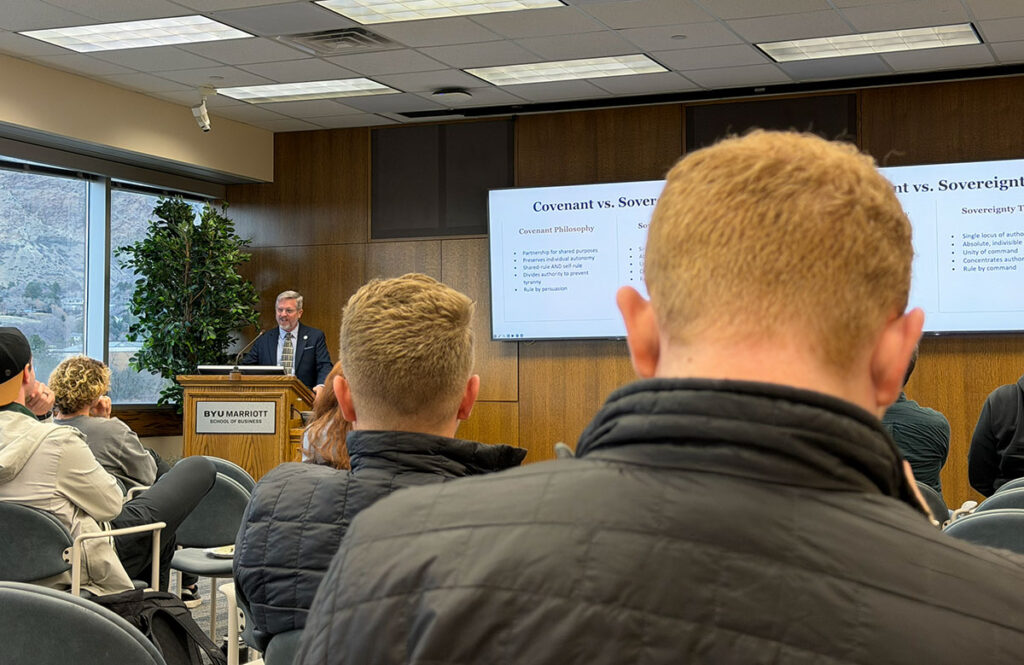 BYU Marriott School of Business welcomed Troy Smith, Professor and Director of the Constitutional Federalism Initiative at the Center for Constitutional Studies at Utah Valley University. Professor Smith led a discussion on America’s founding principles, emphasizing the importance of historical literacy in shaping informed civic engagement.